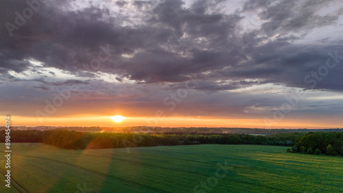 Vue aérienne du coucher de soleil sur fond dramatique très nuageux et orageux au milieu des champs et des forêts du bocage normand en France