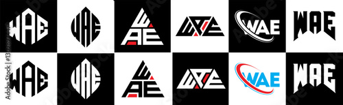 WAE letter logo design in six style. WAE polygon, circle, triangle, hexagon, flat and simple style with black and white color variation letter logo set in one artboard. WAE minimalist and classic logo