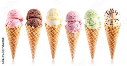 Wafer cones with multi-colored balls of creamy ice cream are arranged in a row on white background