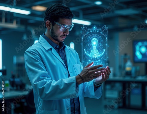 Waist up portrait of male scientist interacting with glowing data hologram in futuristic laboratory lit by neon blue lighting copy space