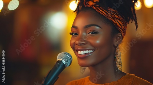 Waist up portrait of smiling Black girl speaking to microphone while giving home concert and show performance copy space : Generative AI