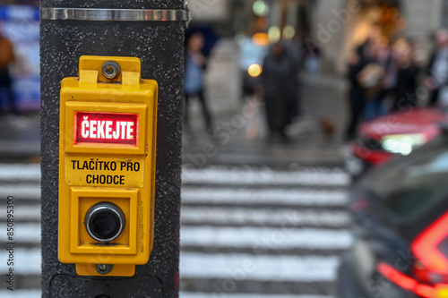 "Wait, pedestrian button", written in the Czech language. Traffic lights for pedestrians in the Czech Republic. Pedestrian crossing.