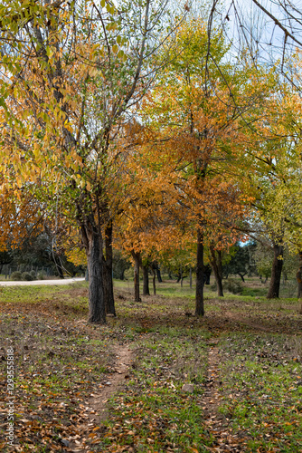 walk along a relaxing autumn path between trees with lush colorful leaves. vertical autumn background.