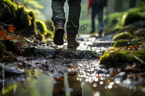 walking in the woods, running in the forest, runs in rainy weather, focus on trail running shoes, mud, water splash