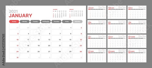Wall calendar template for 2021 year. Planner diary in a minimalist style. Week Starts on Sunday. Monthly calendar.