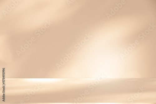Wall interior background, studio and backdrops show products. with leaf shadow from window color beige and white. background for text insertion and presentation of product