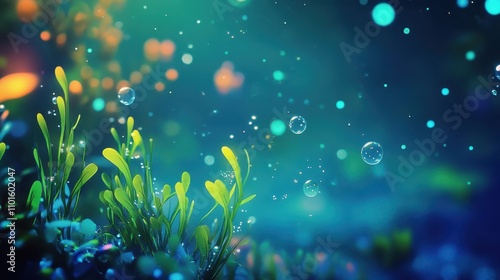 Wallpaper featuring glowing seaweed and bubbles gently swaying in water background