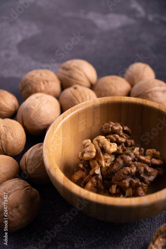 Walnut kernels in wooden bowl and whole walnuts on blue slate surface. Healthy nuts and seeds composition.