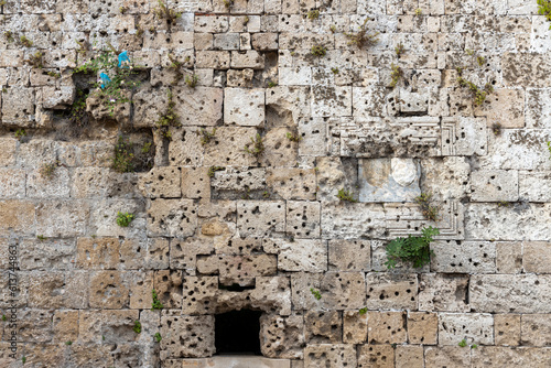 War damage in stone wall in the moat of old town Rhodes, Geece