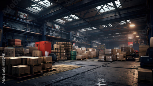 Warehouse Interior Illustration with Shelves, Pallets, and Boxes.