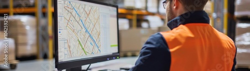 Warehouse logistics planners mapping out routes and organizing shipments on a computer