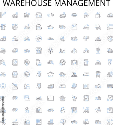Warehouse management outline icons collection. Warehousing, Inventory, Logistics, Dispatch, Automation, Ergonomics, Processes vector illustration set. Fleet, Delivery, Compliance linear signs