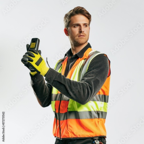 Warehouse manager using a barcode scanner, checking inventory, wearing a safety vest and gloves, looking professional, Portrait half-body, hyper-realistic, high detail, photorealistic, white