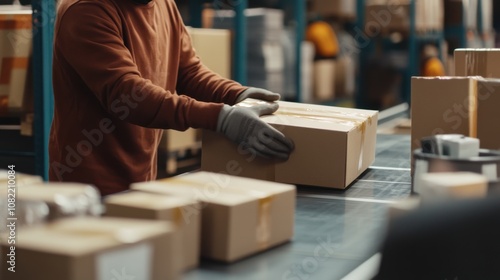 Warehouse Packing Process: Worker Preparing Packages for Shipment at Packing Table with Emphasis on Efficient Packing, Warehouse Management, and Detailed View of Packing Activities and Table Setup