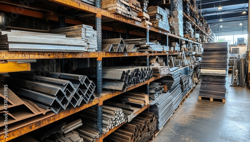 warehouse shelf full of steel beams and metal sheets, showcasing industrial materials in organized manner. atmosphere is functional and efficient, ideal for construction projects