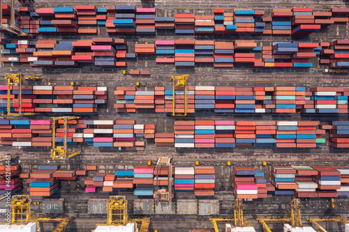 warehouse stacking containers group in a row and cranes load unloading, distribution center for domestic product aerial top view