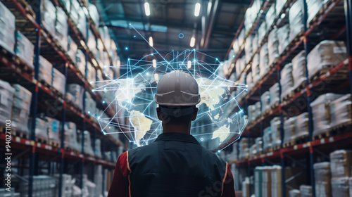 Warehouse Worker Analyzing Global Network Connectivity in a High-Tech Storage Facility..