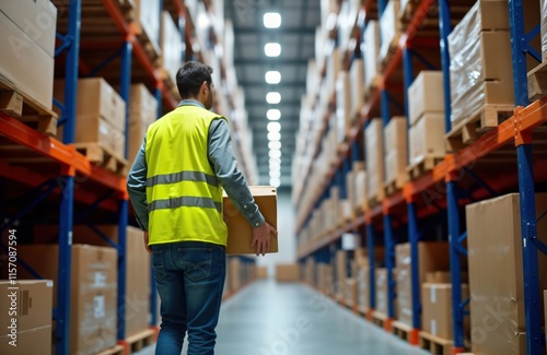 Warehouse worker carries box. Industrial setting. Distribution center worker prepares shipment. Logistics process. Man holds package. Focused on work. Goods storage area. Interior shot of a factory.