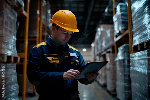 Warehouse worker checks inventory with tablet in dimly lit storage area during evening hours