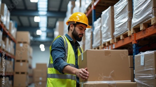 Warehouse worker expertly stacking boxes to optimize storage space and efficiency. In a busy warehouse, a production worker is diligently stacking and organizing boxes.