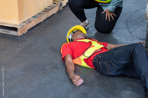 Warehouse worker lying down on floor after having accident from working in the factory. safety and protection for risky career