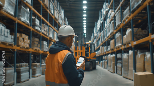 Warehouse Worker Using Digital Tablet for Inventory Management in Large Storage Facility