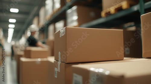Warehouse worker walking through storage warehouse with rows of shelves and cardboard boxes containing goods ready for dispatch