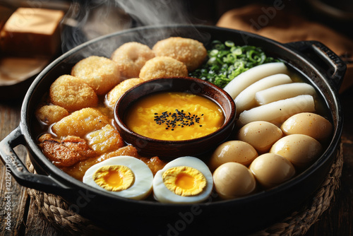Warm and inviting oden pot filled with daikon, boiled eggs, fish cakes, and konjac on a rustic wooden table
