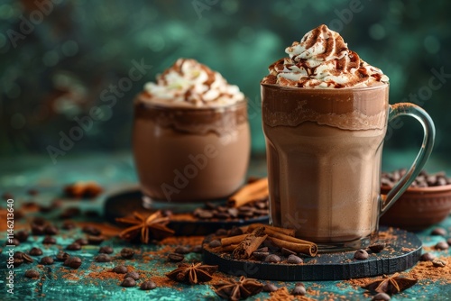 Warm beverages topped with cream and cocoa garnished with cinnamon on a rustic green surface