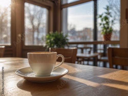 Warm cafe scene with coffee cup, sunlight, wooden table, and window view
