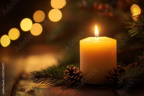 Warm candlelight shines on pine branches and cones, creating a cozy atmosphere during the holiday season Generative AI