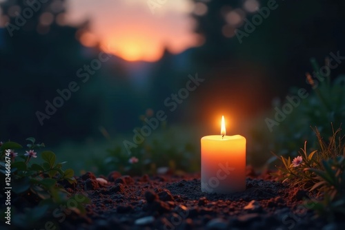 Warm candlelight softly illuminates a serene evening landscape at dusk, nature, candle, warm light
