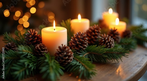 Warm candles nestled among pinecones and evergreen branches create a cozy, festive ambiance, enhanced by soft bokeh lights in the background