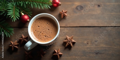 Warm Cocoa Drink beside Festive Evergreen Branch and Star-Shaped Ornaments on Rustic Wooden Surface