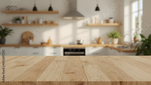 Warm Cozy Morning: Minimalist Wood Tabletop with Soft Bokeh Kitchen Background | Empty Space for Text, Natural Wood Texture, Ambient Sunlight