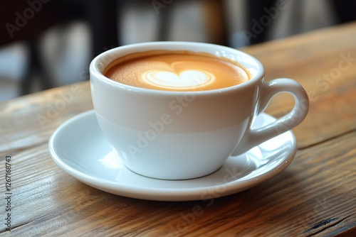Warm cup of coffee on wooden table at a cozy cafe during morning hours