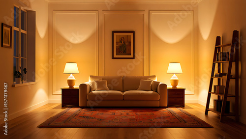 Warm Evening Living Room: Beige Sofa, Oriental Rug, Table Lamps, Bookshelf, Calm Ambiance.