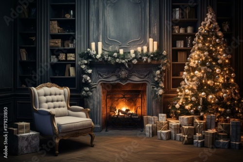 Warm fire burning in elegant fireplace in a classic living room decorated for christmas with illuminated tree and presents