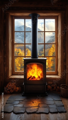 Warm fireplace in a wooden cabin. Ideal for cozy autumn or winter themes.