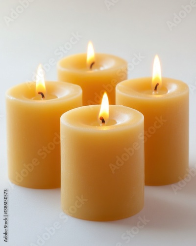 Warm glow of beeswax candles illuminating a serene space casting soft shadows creating a peaceful atmosphere simple elegance and minimalist design