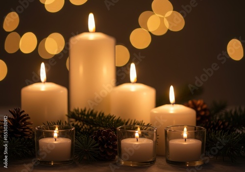 Warm glow of lit candles with pine cones and fir branches creates a cozy festive atmosphere with soft bokeh lights