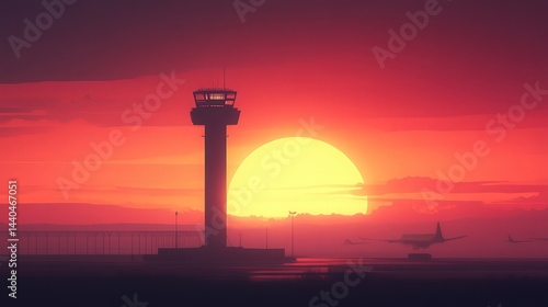 warm glow over the airport control tower, its silhouette standing tall against the beautiful backdrop of the sky.
