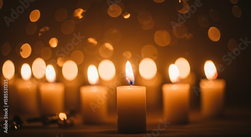 Warm, glowing candles are lit, creating a soft, blurred bokeh effect in the background, suggesting a peaceful and reflective atmosphere.