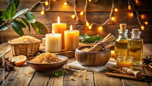 Warm, glowing candles, aromatic oils, and golden sugar crystals set the stage for a luxurious spa experience.