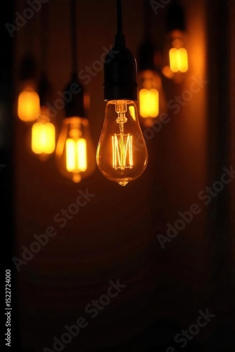 Warm, glowing light bulbs illuminate a dark room, creating a cozy and inviting atmosphere Perfect for home d?cor, interior design, and lighting concepts , cozy, inviting, shine
