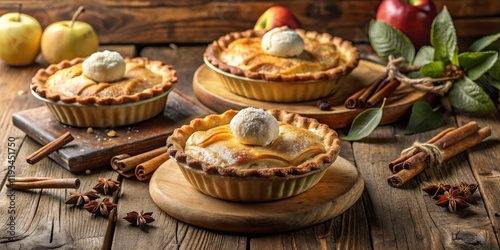 Warm, golden apple pie with a dollop of whipped cream and a sprinkle of powdered sugar, nestled on a rustic wooden table with cinnamon sticks and star anise