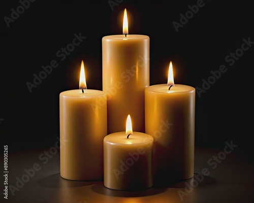 Warm golden flames dance atop three elegant pillar candles, casting a soft glow against a stark black background, exuding tranquility and ambiance.