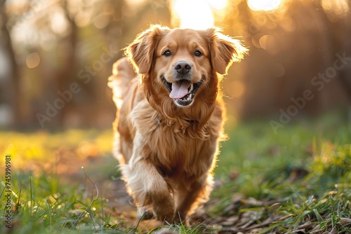 Warm, golden hour photo of a golden retriever approaching the camera, face purposely not in focus, in lush outdoor setting