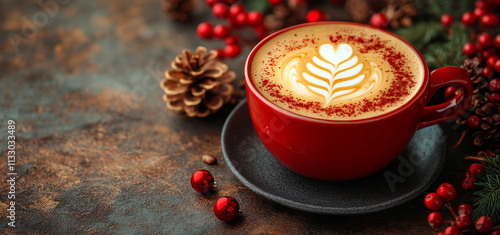 Warm latte art in a cozy holiday setting. A red cup with intricate latte art sits on a dark plate surrounded by festive decorations and pine cones.