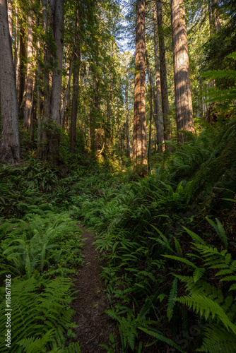 Warm Light Hits Tree Trunks While Ferns Still Lay In Shadow